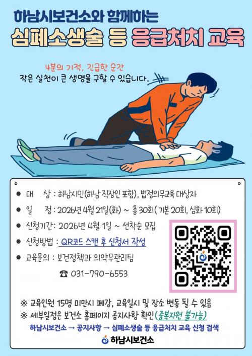 [½Åµ¿¾Æ¹æ¼Û Çϳ²½Ã=À̽ŵ¿±âÀÚ] Çϳ²½Ãº¸°Ç¼Ò´Â ½Ã¹ÎÀÇ ÀÀ±Þ»óȲ ´ëÀÀ ´É·ÂÀ» °­È­ÇÏ°í ¾ÈÀüÇÑ Áö¿ª»çȸ ȯ°æÀ» Á¶¼ºÇϱâ À§ÇØ ¿À´Â 4¿ù 21ÀϺÎÅÍ 11¿ù 3ÀϱîÁö ¡®2026³â ½ÉÆó¼Ò»ý¼ú µî ÀÀ±Þóġ ±³À°¡¯À» ½Ç½ÃÇÑ´Ù°í 10ÀÏ ¹àÇû´Ù. À̹ø ±³À°Àº ±âº»¹Ý 20ȸ¿Í ½ÉÈ­¹Ý¡¦